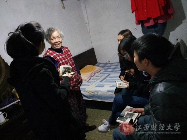 打开门看到一群甜甜地叫着“奶奶好”的志愿者们,老人满是皱纹的眼角闪着喜悦的泪光。在窄小昏暗的房间内,她向志愿者们讲述了她的父亲、伯父以及丈夫在解放战争中的光辉事迹,并展示了那个艰苦时代留下来的书籍资料。志愿者们聚精会神,生怕错过了任何一个环节。最后,她也对志愿者们提出了感念曾经的艰苦,珍惜现在的舒适,好好学习,努力为国家做出贡献的真诚希冀。
