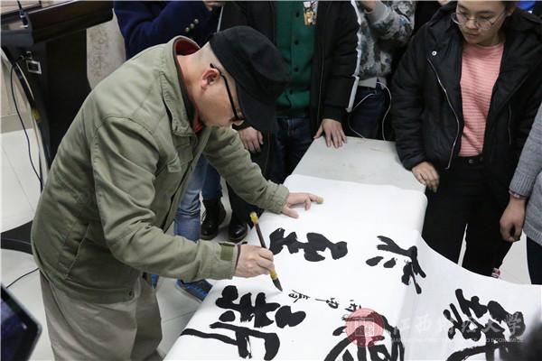 最后,对于同学们在讲座以及美术创作过程中遇到的种种问题,唐教授一一进行细致而有耐心的答复与指导并向在场的师生们进行了书法展示,他用毛笔铿锵有力的挥洒出“将大有为”四个大字。整场讲座图文并茂,内容丰富,生动有趣,掌声不断,在座师生表示获益良多,受到了一次艺术与美的精神洗礼。(图文/艺术学院 李鑫 赵文静 编辑/姜莹)