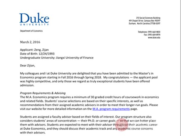 春风沐经院,桃李散芬芳。又是一年毕业季,来自经济学院创新实验班的曾子健同学以优异的成绩拿到美国杜克大学的录取通知书,成功获得出国留学深造的大好机会。
