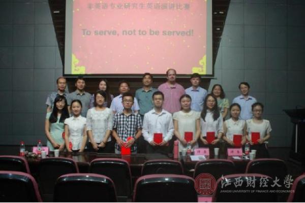 5月29日晚,由江西财经大学研究生会主办的第六届研究生英语演讲比赛(非英语专业)在研究生学术报告厅举办。我校外国语学院副院长曾剑平、谢海长、李春长,外语竞赛中心主任张建丽、大外一部主任杜景平和美国外教Dan Rust作为评委出席了本场比赛,研究生院副院长荣莉、魏清华作为嘉宾观看了比赛。
