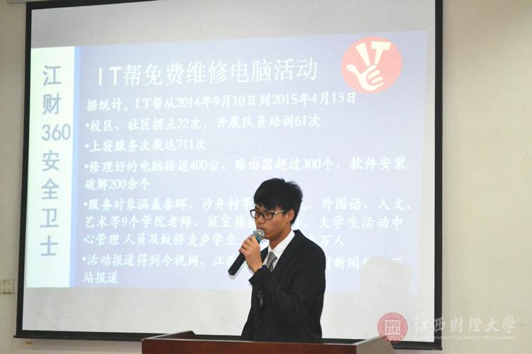 首先,是由青协部们发表述职报告,青协部长刘洋向大家一一介绍了青协的成立时间、结构组成及参与活动等,对于青协的成长壮大历程,他表示颇有感触,心协从最初仅有几个人到如今已有二十几号人,大家从最初的一无所知到现在也能独当一面,相互协助共同完成任务,为软通人的志愿服务做出了无私的奉献。接下来是由软通特色部门IT帮帮主施毅做述职报告,在报告过程中他说到作为软通学院的特色部门,IT帮一直依托学院专业特色,用所掌握的IT 知识,为全校乃至社会提供免费的电脑维修,IT咨询等特色服务。他说到这一年来,IT帮已经面临提升瓶颈,单一的IT服务已经不能满足学校对IT帮的期望。IT 帮的改革势在必行,他也提出了相应的改革方案,例如作为软通学院的人才培养库,为软通学院培养能在IT项目上独当一面的人才。然后分别是由实就部部长张方舟、 组织部部长宋伟平发表报告,其中张方舟在报告中说到他们的部门口号“实就加油,软通加油”更是赢得了一阵热烈的掌声。最后在本次述职报告中,第一名桂冠由实就部摘得,第二名是组织部,记者团与网络部并列第三。