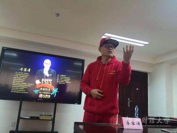 在同学们的期待下,一位身穿红色运动服、头戴棒球帽的中年男士进入报告厅,谁也没有想到他竟是李宝清老师,扑面而来的活力和热情弥漫了整个教室,他幽默诙谐的开场白:“同学们为了和你们保持一致,为了充分展现创业者的精神风貌,我特意挑选了这身服装,当然如果你们觉得难以忍受,请聆听我,不要正视我。”惹得在场观众哄堂大笑,这一举也成功拉近了与观众的距离,让整个气氛变得轻松愉悦。